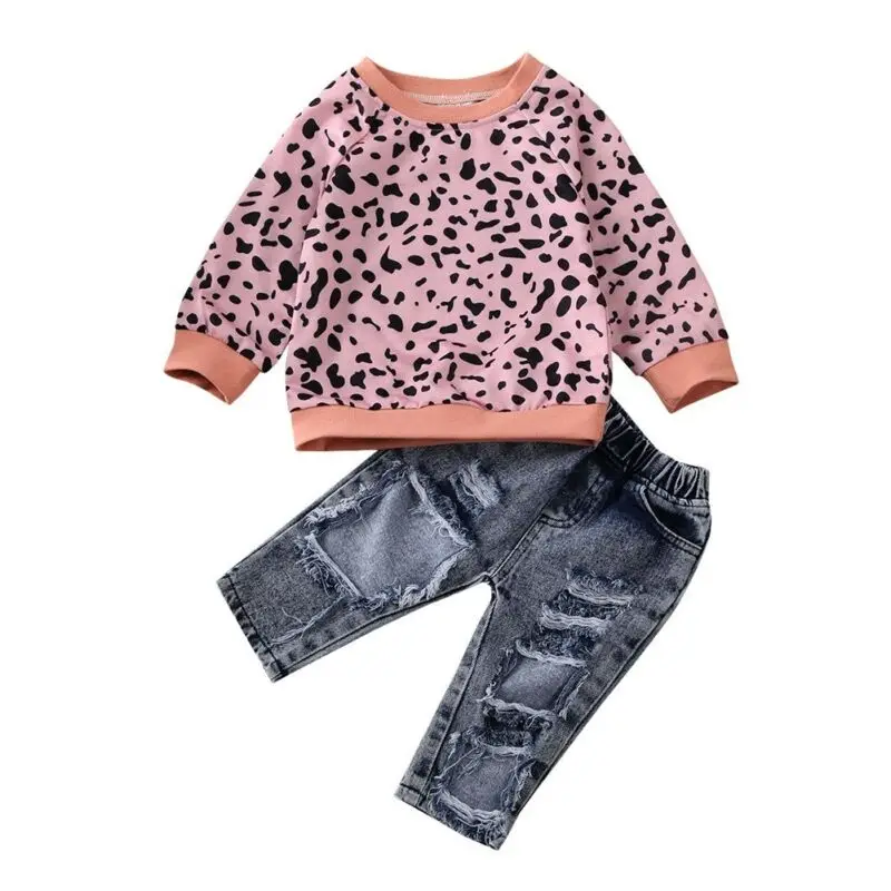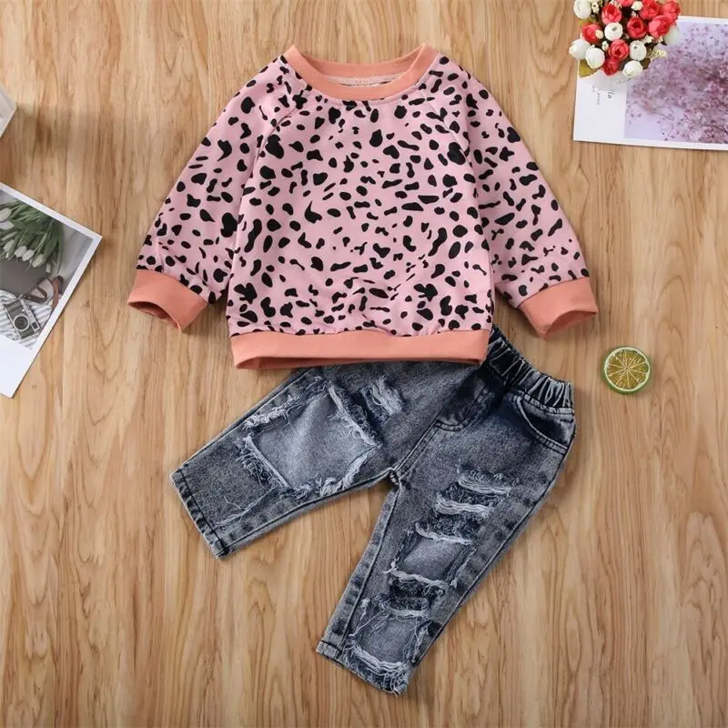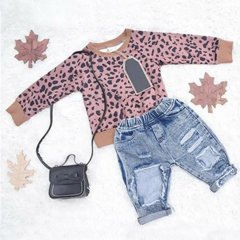 Special Chance for 2Pcs Kids Baby Girls Outfits Fashion Cute Leopard Print Long Sleeve Top Sweatshirts+Ripped Denim Je